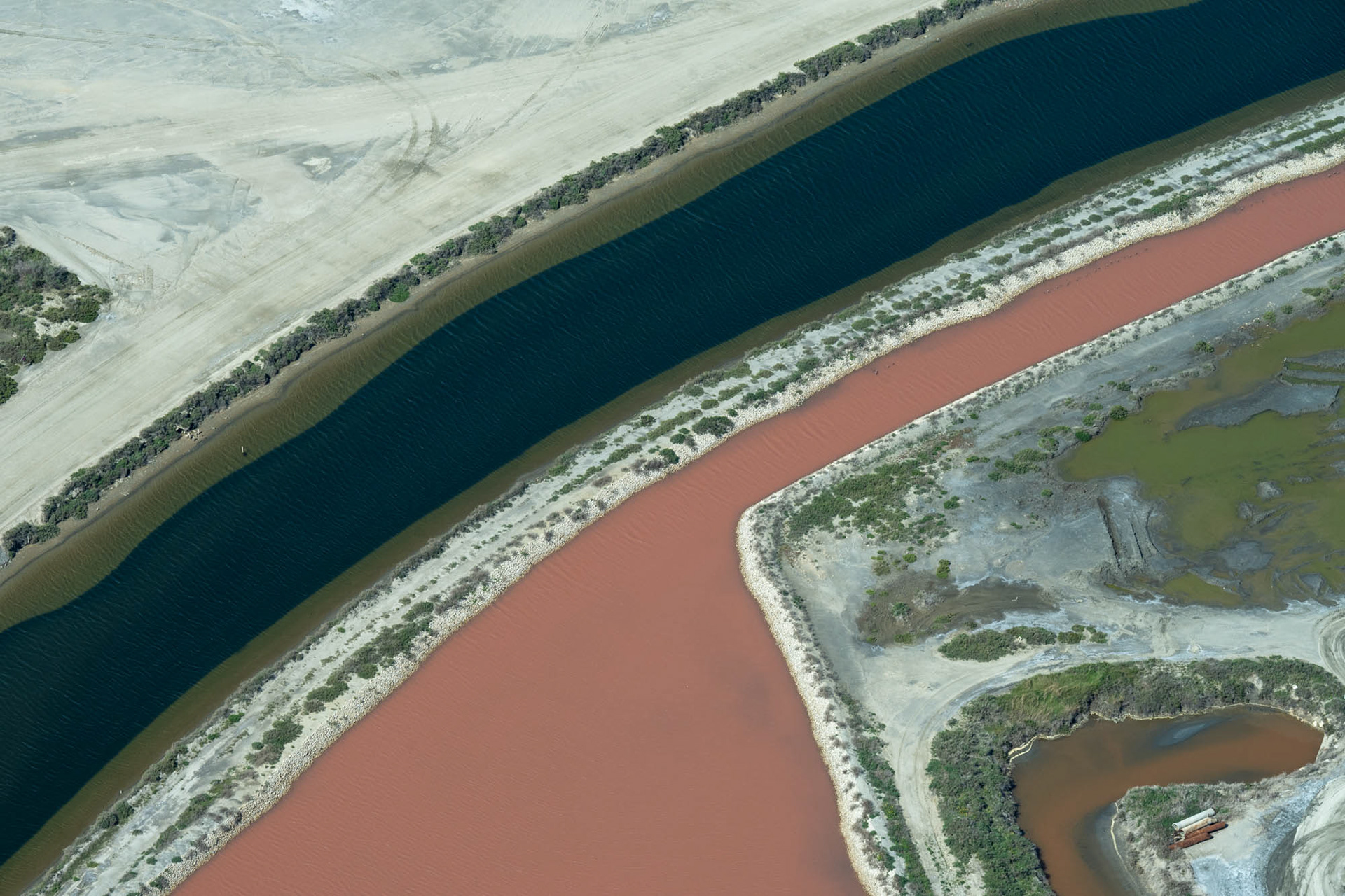 Flying at 500' in a helicopter (with the doors off) over the salt marshes on the S coast of France near Aigues Mortes and Montpellier. Known as the Salin d'Aigues-Mortes, it is the largest salt marsh in the Mediterranean, producing about 500,000 tons of salt per year. Microscopic algae are found in the concentrated salt water giving the various hues by synthesizing beta-carotene to protect itself from the sun.
